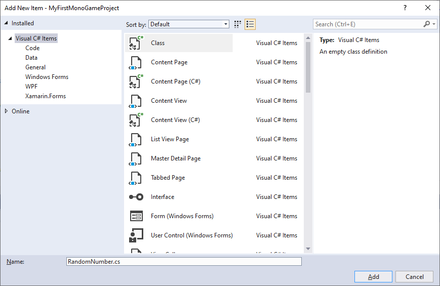 In the Add New Item window, select Class and enter a Name. In this example we call it RandomNumber.cs. Click Add when finished.
